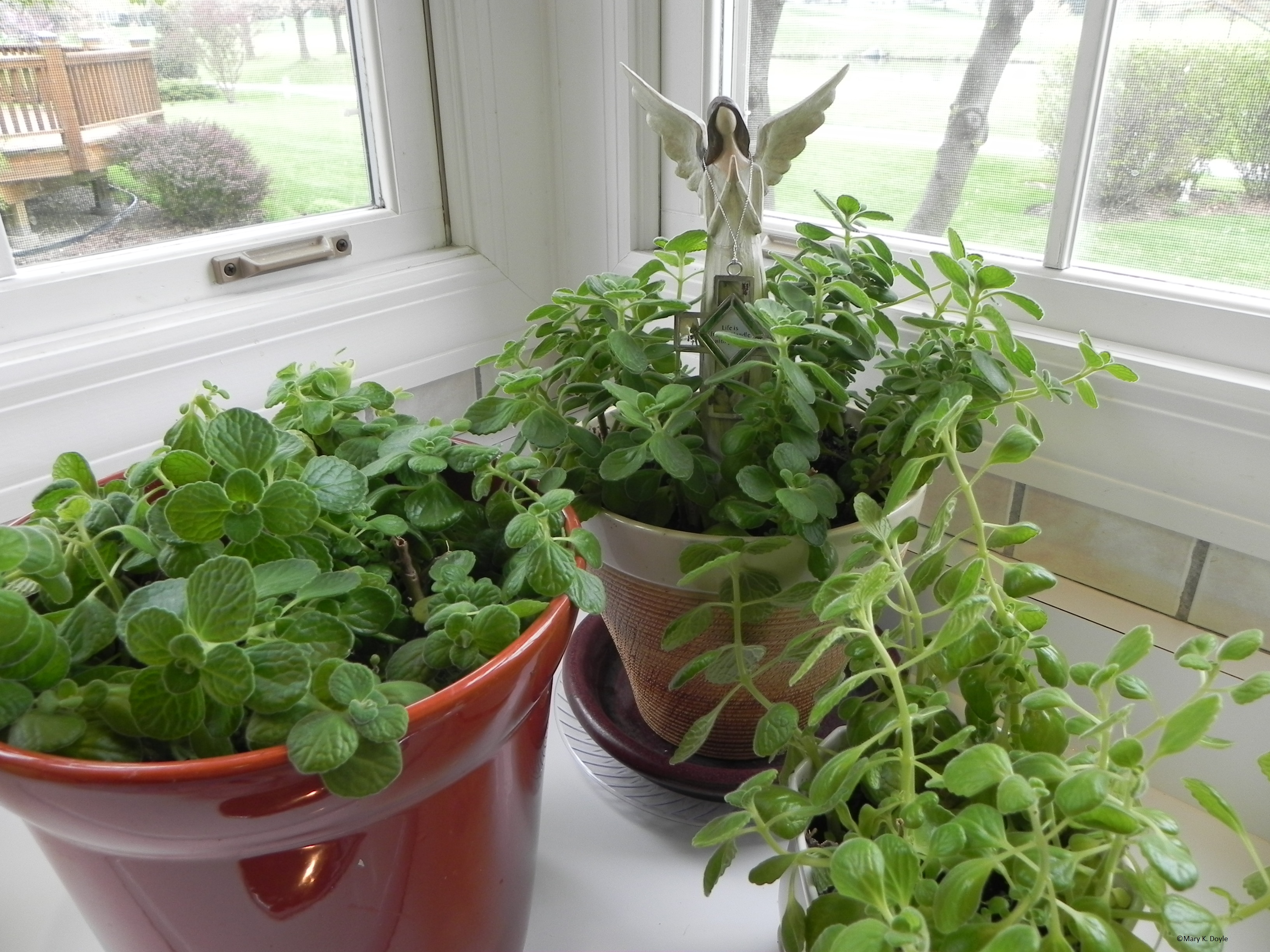Patti thought the plant was Mexican oregano. The leaves are succulent, furry and bright green and have a very pungent aroma. Patti gave me a few teeny cuttings in a pretty pot she stenciled. As the plants grew, I broke off the tops and just stuck them in the soil. The cuttings quickly matured and outgrew the little pot. I started another bigger pot and have continued to do so many times over.
