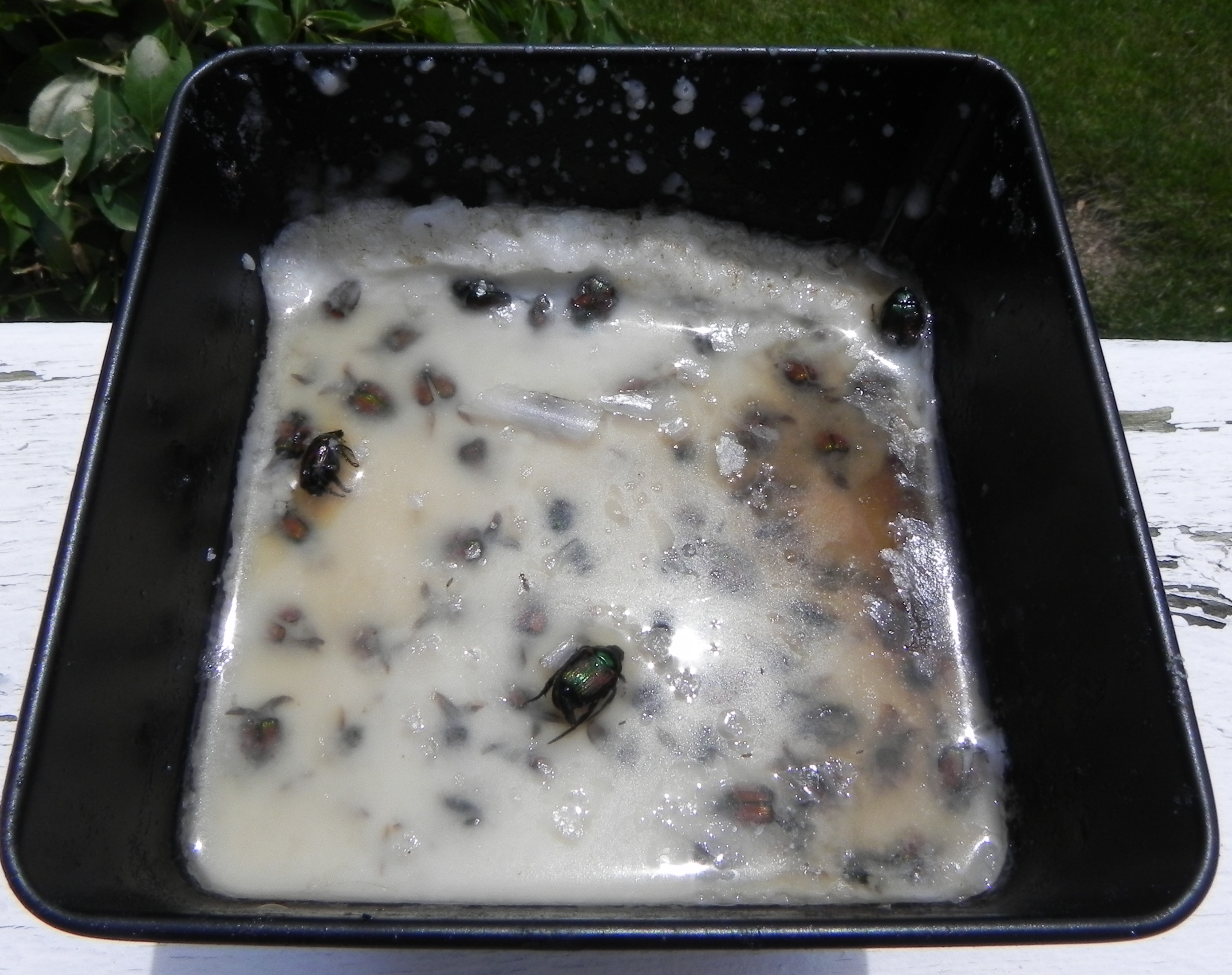 I recently set two unlit citronella candles out on the ledge of the deck during a barbecue. The following morning I found dozens of the Japanese Beetles frozen in the melted candles. I hadn’t even lit the candles. They melted in the warm sunlight.