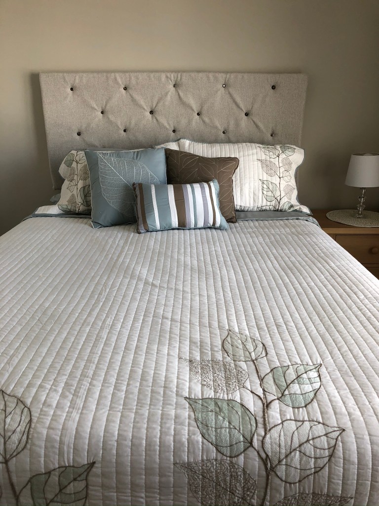 I also made a headboard for the guest bedroom. The normal way would be to attach covered foam to plywood and hammer nails where you would want tufting. However, I simply covered foam with fabric and used an assortment of buttons I had. I sewed the buttons with a long needle to pull them in as much as I could. The tufting isn’t dramatic, but I’m happy enough with the end result.