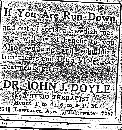 Ironically, before vaudeville ended, my grandfather studied and became a member of the Illinois Association of Physio-Therapists. An undated letter of invitation was sent out announcing that his office on Lawrence Avenue in Chicago was open to treat “sprains, lumbago, sciatica, nervousness, neuritis, neuralgia, poor circulation, rheumatism, dyspepsia, constipation, reducing, and rebuilding through the use of Swedish massage, ultra violet ray, and infrared ray. Grandpa was forced to close his practice when patients were unable to pay during the Depression but continued to be called Doctor Doyle.