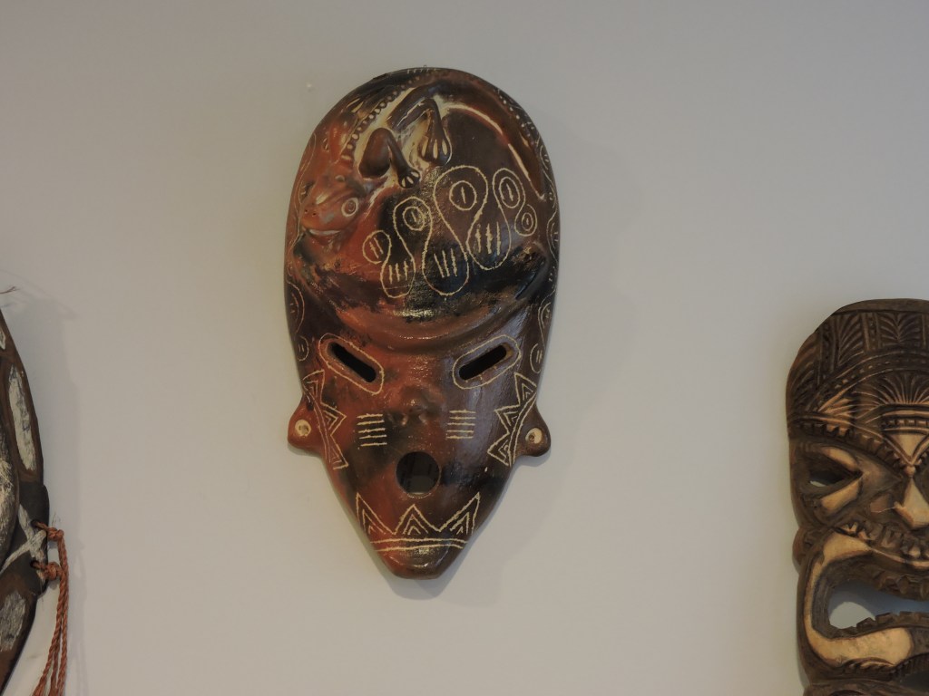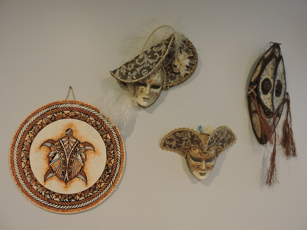 One of the few collections I have is a wall grouping of masks, carvings, and a painting I’ve acquired from my travels. In addition to the one made from ash, the collection includes a ritual mask from Papua, New Guinea purchased in Hawaii and one made by the Incas and purchased in Aruba, festival masks from Venice, Italy, face carvings from Alaska and Jamaica, a totem from Hawaii, a leather work from Portugal, and a painting of a turtle on tapas, a type of fabric carefully and arduously made from softened wood bark. My attraction to these items stemmed from their craftmanship, symbolism, and personal contact with the artist or vendor.