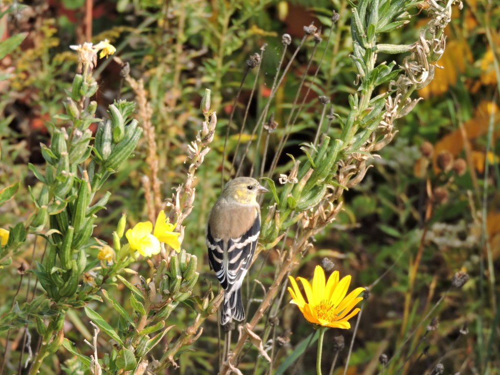 An American Goldfinch, in its winter coat, calmly posed for us in a bed of wildflowers.