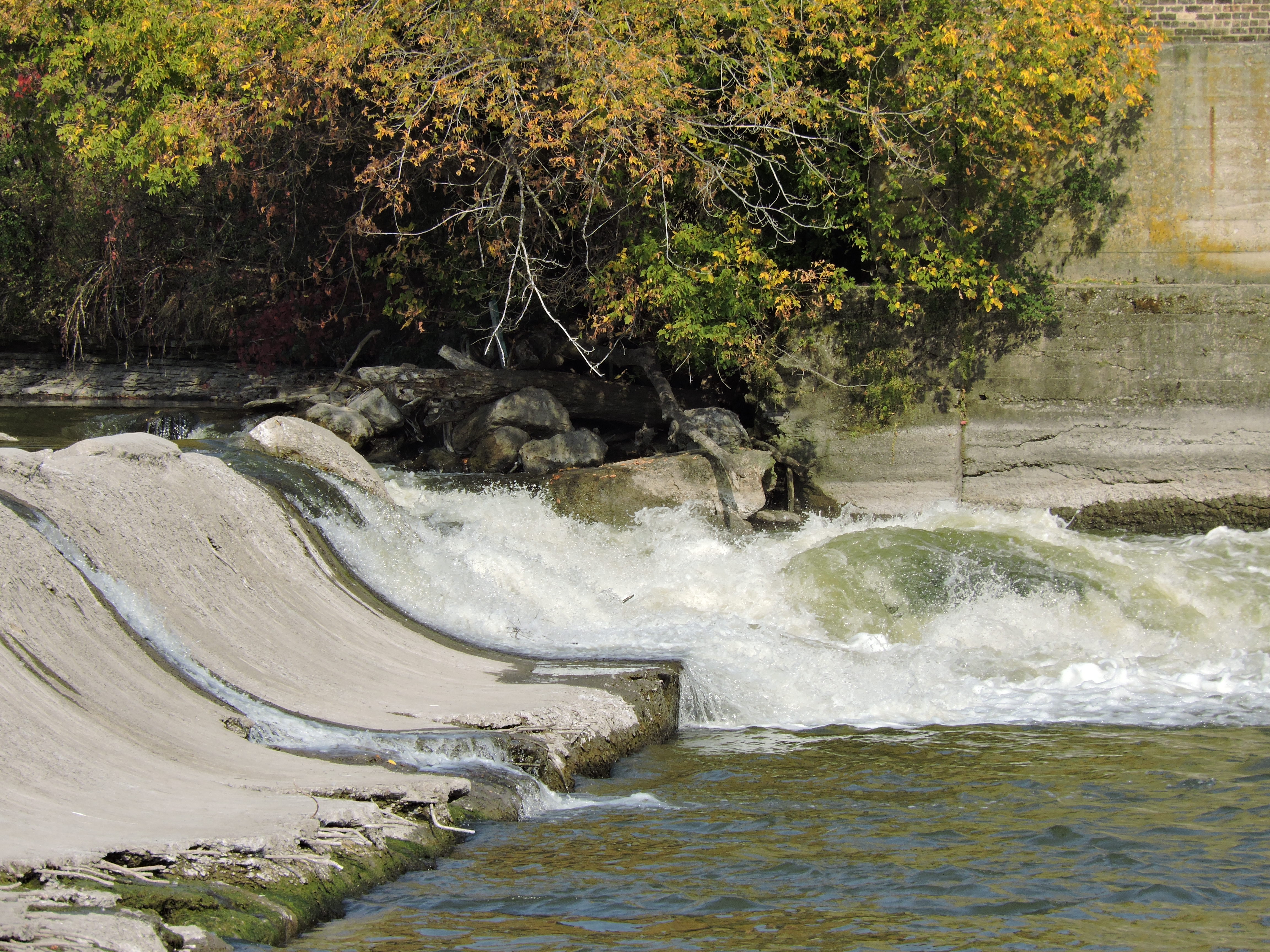 The river leapt over the little dam.