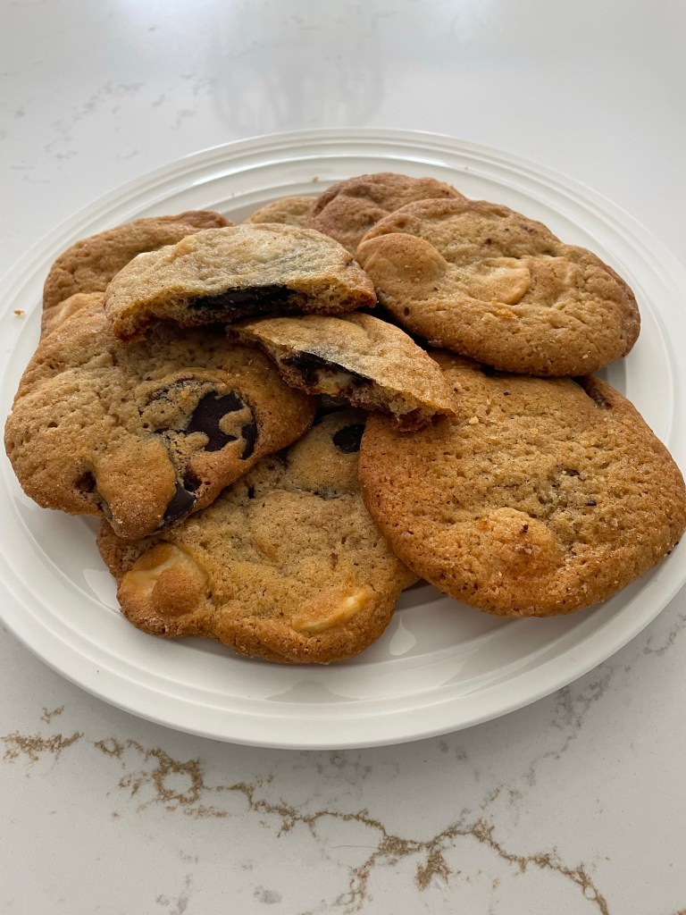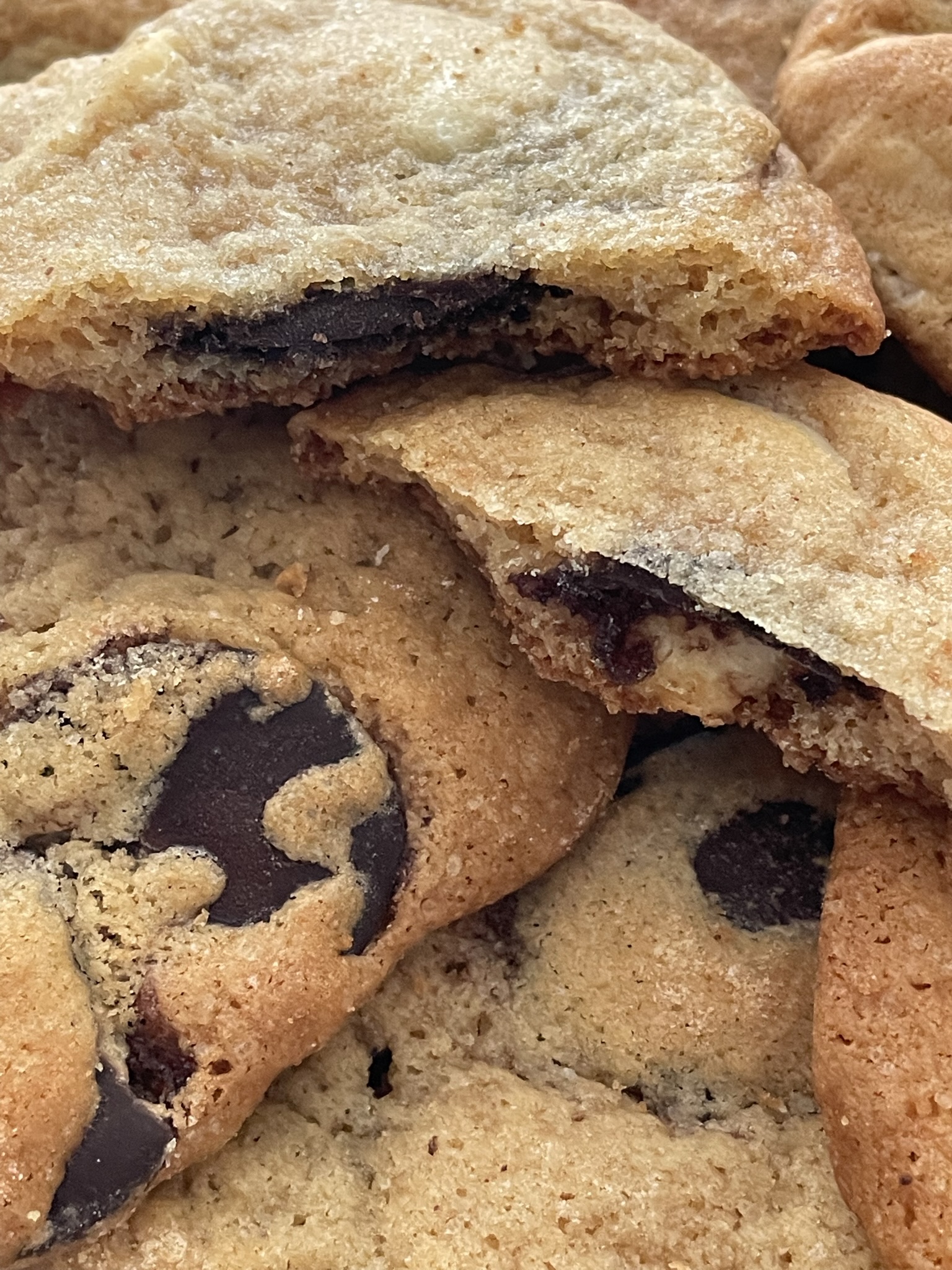 I believe these cookies are so delicious partially because of the two types of chocolate, but mostly, it’s due to the quality of the ingredients. I use sea salt, pure vanilla, and organic sugar, butter, eggs, and flour and chocolate from a specialty chocolate shop (Graham’s Fine Chocolates and Ice Cream) in my town. The cookie is delectable because of the decadent ingredients.
