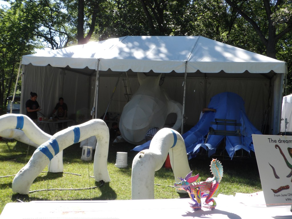 The Cantigny Park alabrijes creations begin with a design on paper by one of 6 artists from Mexico City. If accepted, the creature is made in miniature. Then it is painstakingly replicated in full.