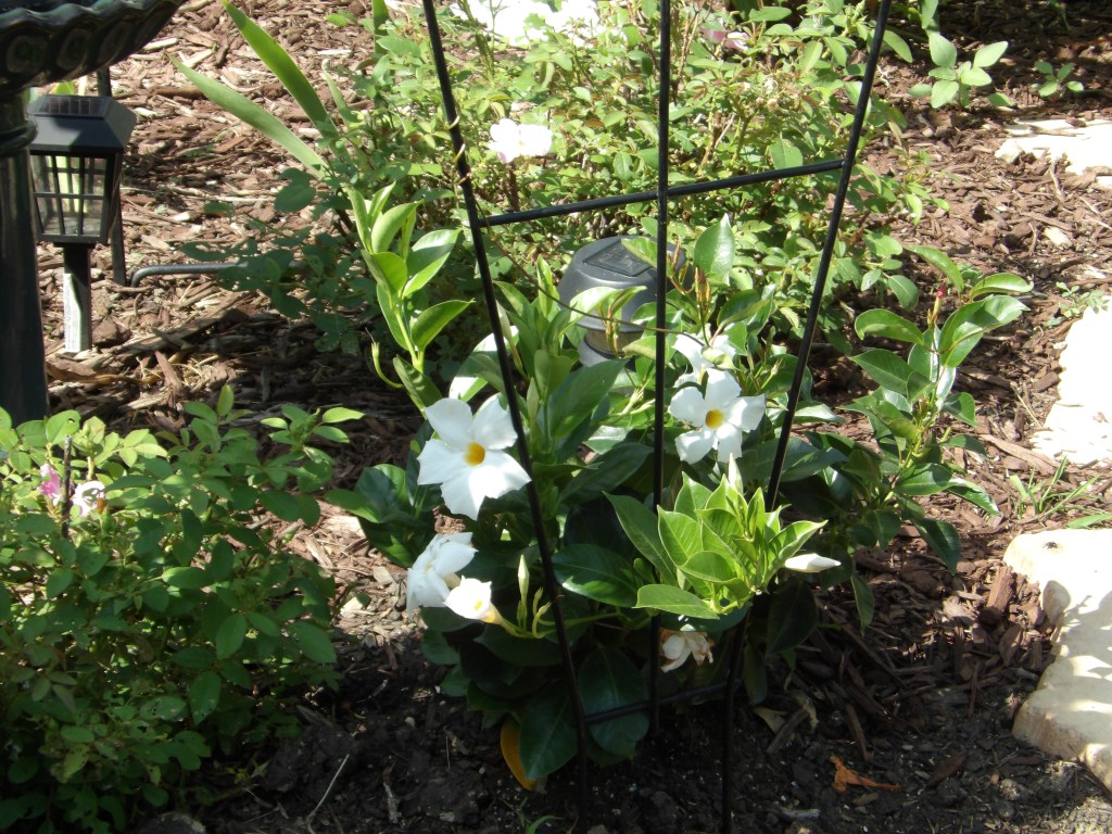 I later noticed the small one was labeled dipladenia. With a little research, I found that dipladenia is a type of mandevilla. However, the taller variation is simply noted as mandevilla.