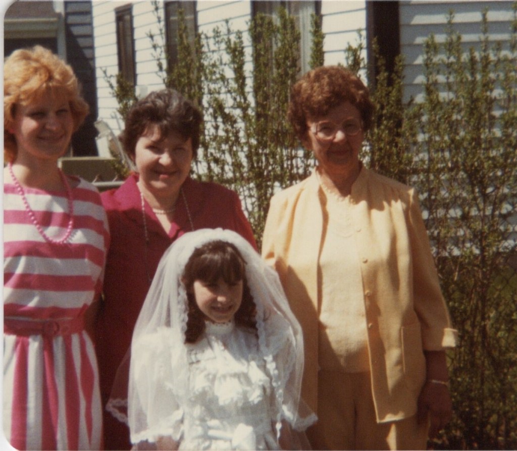 Four generations – Me/Mary; my mother, Patricia; my grandmother, Florence, and daughter, Lisa, on Lisa’s First Communion Day, 1984