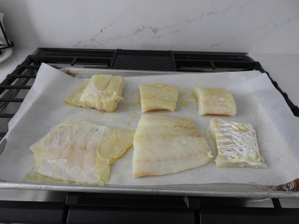 Place the fish on a baking sheet lined with foil or parchment paper. Oil the top of the fish. Bake until flakey. (The fish can also be simmered in a skillet with water.)