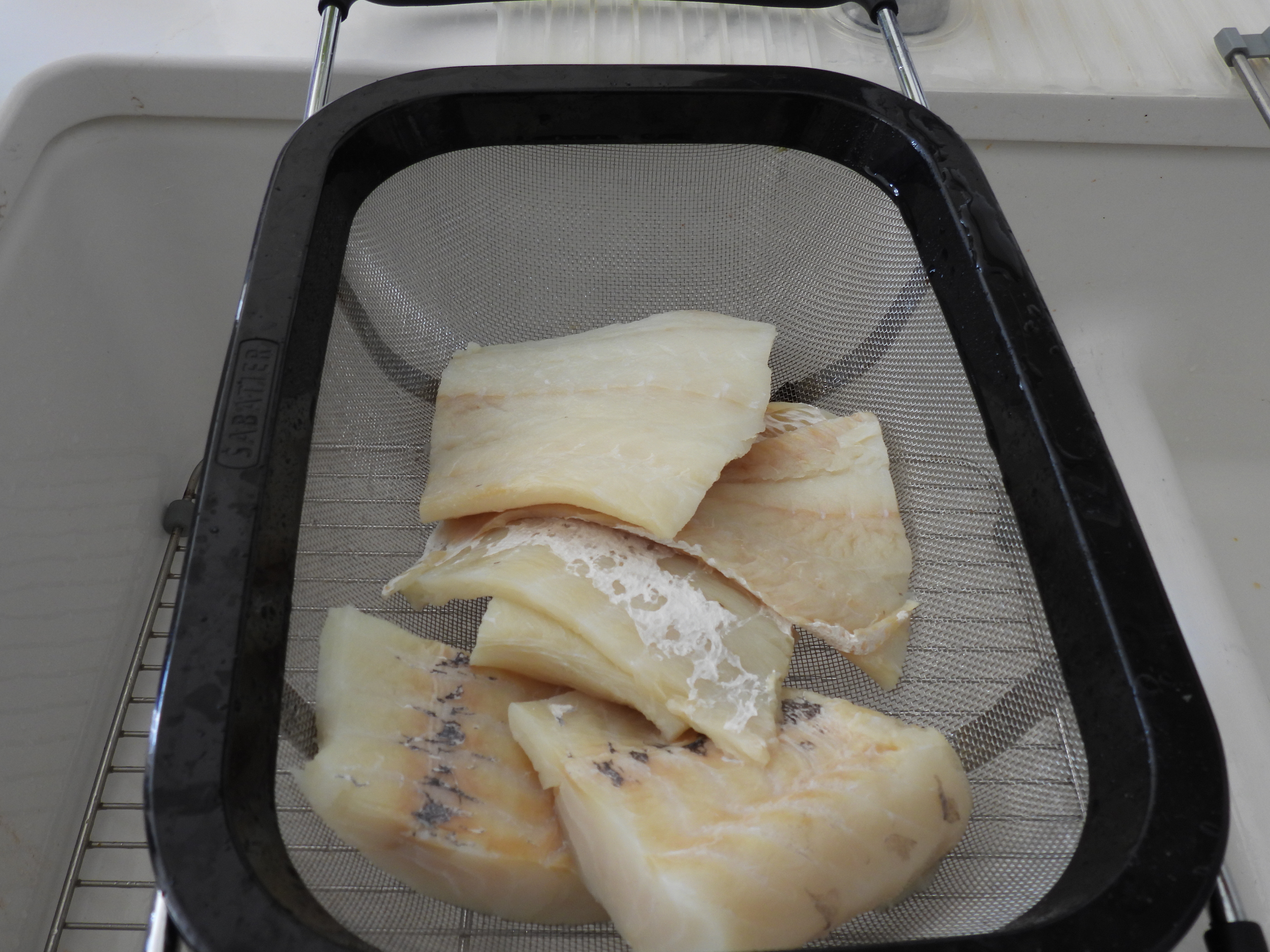 Drain the prepared cod in a colander. Pat it dry with a paper towel.