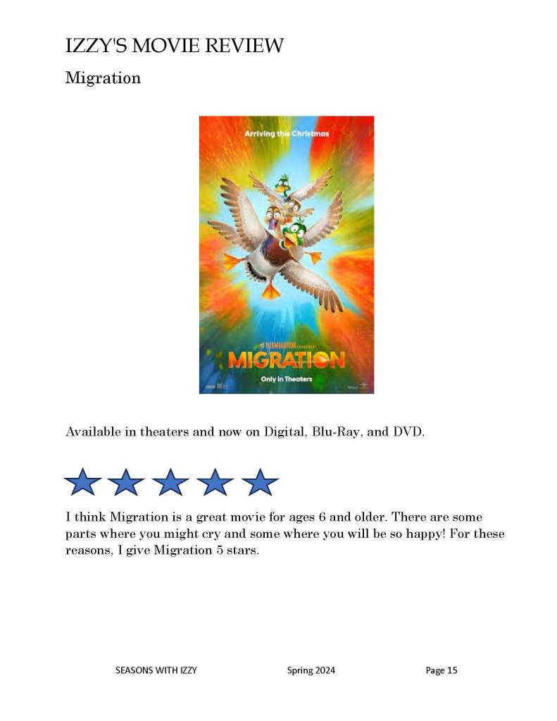 Our spring edition of “Seasons with Izzy” includes features on dogs and weather, an interview, a short fiction story, list of holidays and events in the spring, crossword puzzle, dot-to-dot puzzle, movie review, and fun facts about dogs.