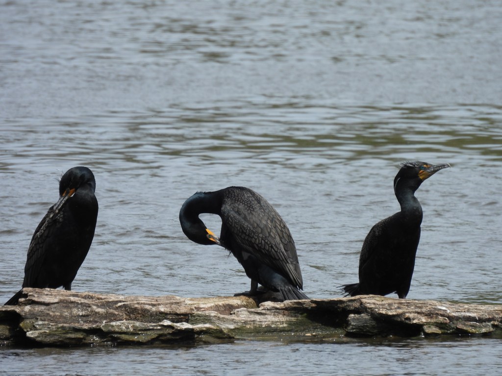 I was out looking for flowering trees when I spotted double-crested cormorants gathered on driftwood in the middle of the river. I’d never seen these birds before. Another photographer filled me in on some of the basics.