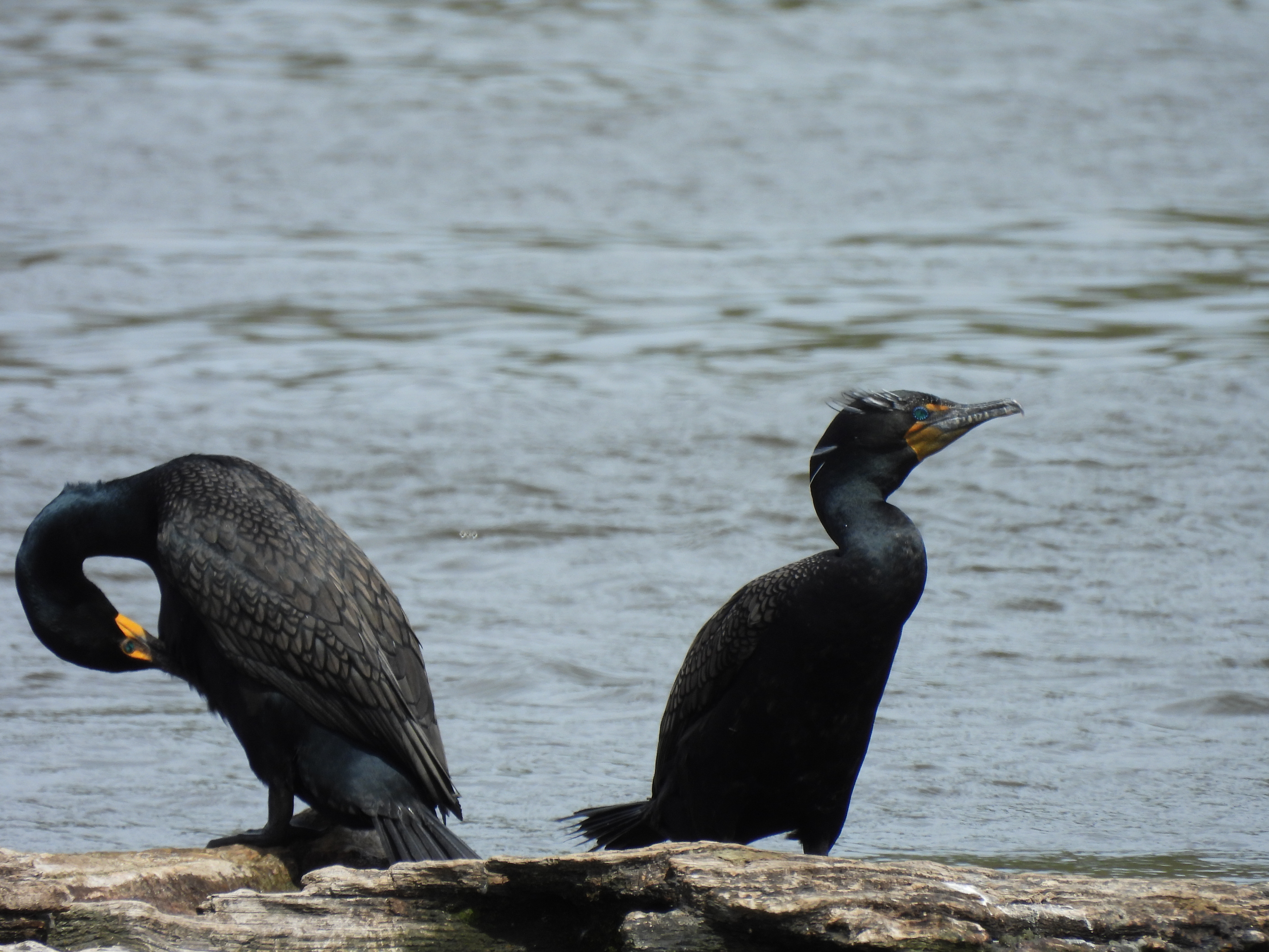 Double-crested cormorants are large waterbirds with long, thin, hooked bills. Adults are dark brown with small patches of yellow-orange on the face.