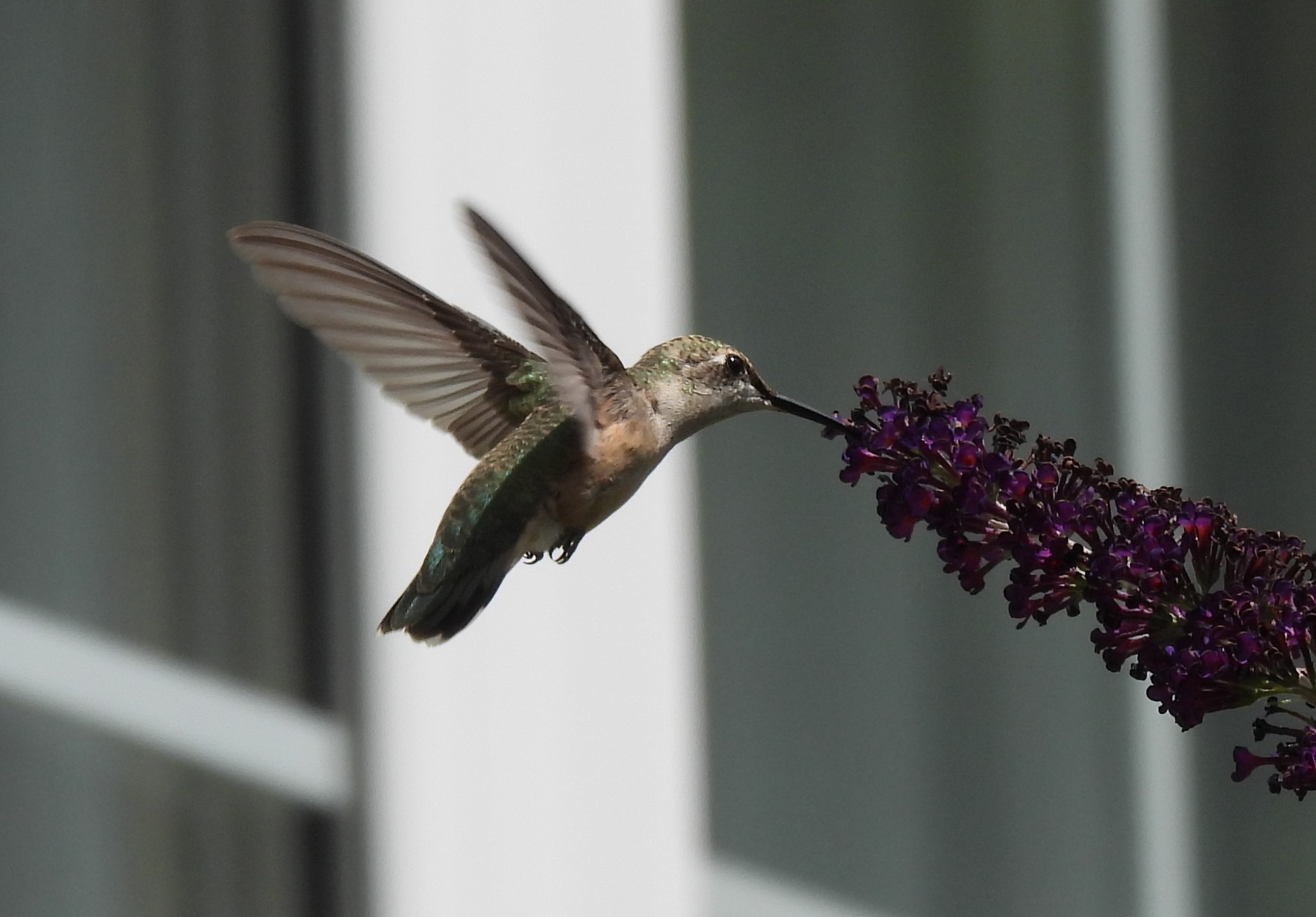 Red-throated hummingbird on butterfly bush and on a feeder. Notice the bird’s long tongue extended beyond the beak.