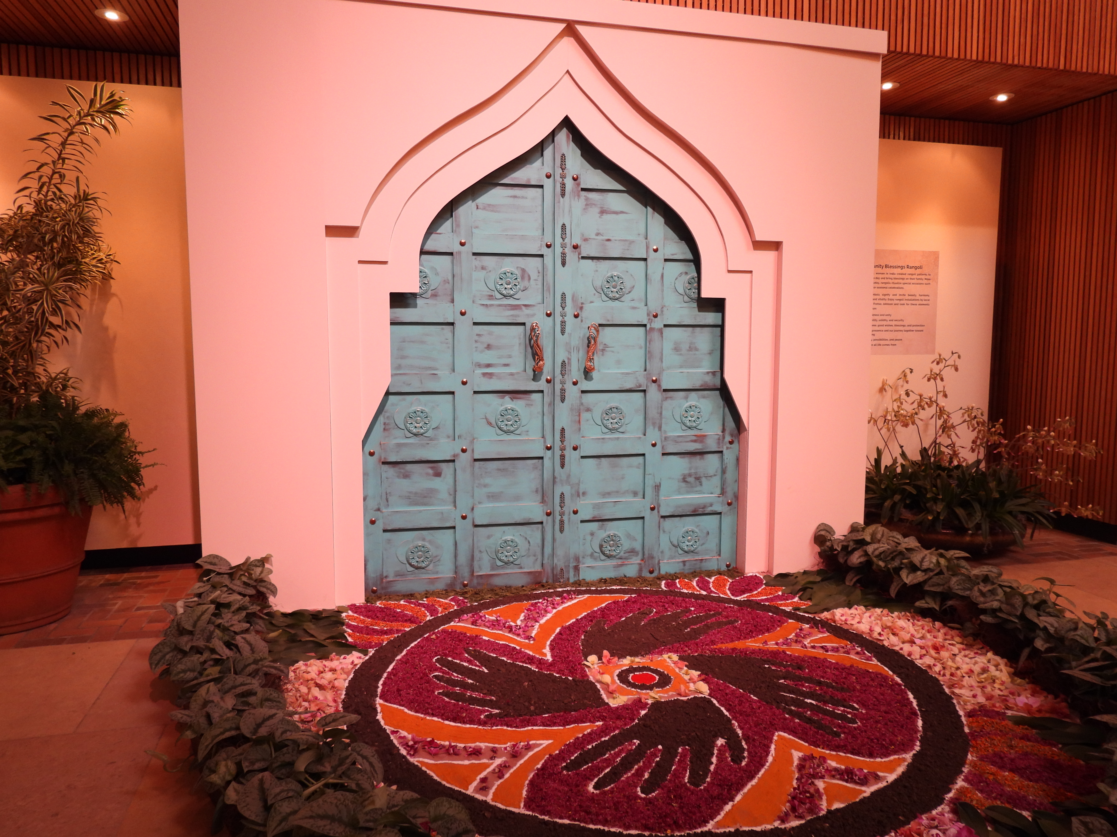 Rangoli is traditional Indian floor art created with plant materials. Symbols of harmony, vitality, balance, and beauty are signified in the display.