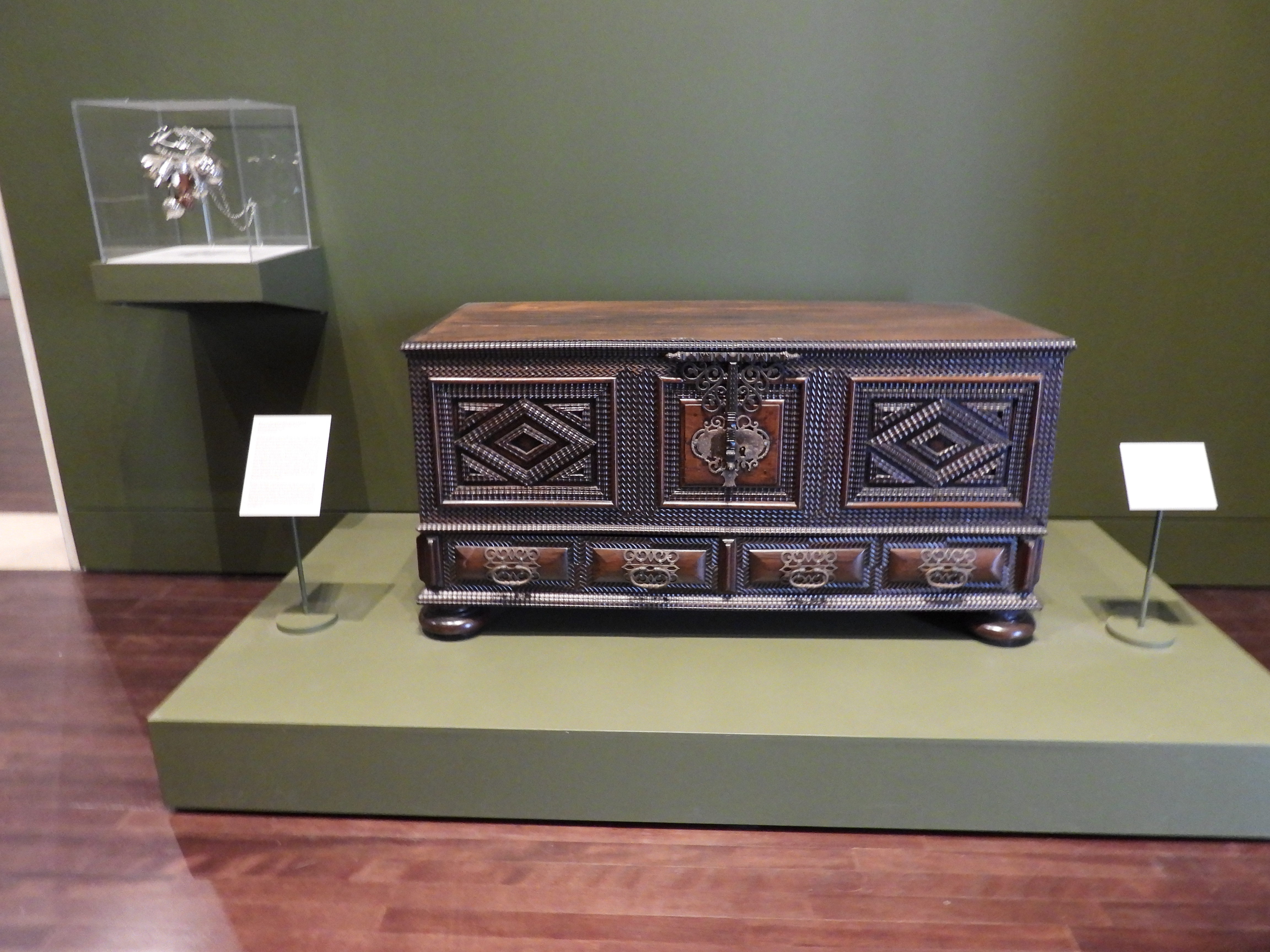 Some chests serve as works of art as well as for functionality. This intricately carved chest from Brazil, 1720, was used for garments and is surprisingly lightweight.