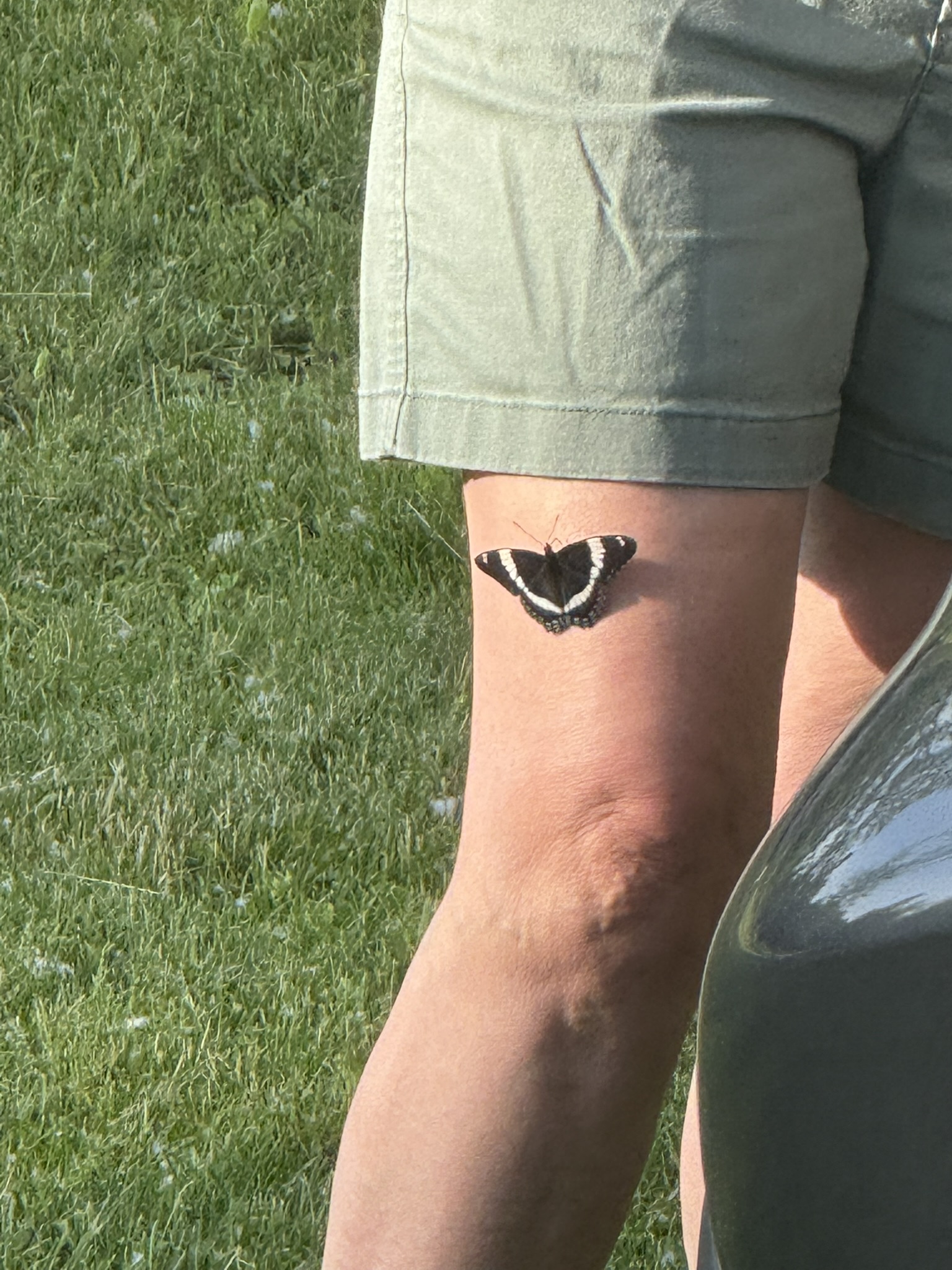 In addition to the usual mosquitoes and other insects, butterflies also land on me and will stay if I talk to them. This black swallowtail remained on my leg while I loaded the trunk of the car. When I tried to shoo it away, it flew to my arm and remained there while I explained to it that I had to leave, and so it must, as well. I finally needed to gently brush it off.